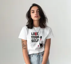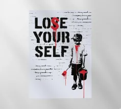 "This illustration, created using stencil technique, imbues any wall with significant meaning by transforming a well-known slogan, inviting deep reflection on self-acceptance and identity. Through the vibrant red colour, the artist conveys a powerful sense of urgency, symbolising the internal struggles we often face. It acts as a mirror for the viewer, challenging them to examine their own relationship with self-love and self-criticism. A piece that undoubtedly leaves a lasting impression."