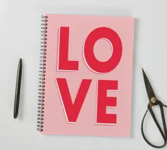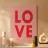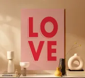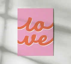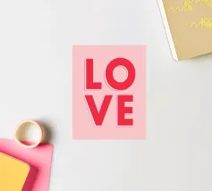 Un design audace e senza tempo che presenta la parola "LOVE" in grandi lettere maiuscole, con ogni lettera dallo stile unico: una piena di rosso vibrante, un'altra con una sfumatura di rosa e oro, una ornata da motivi floreali e l'ultima con un effetto neon luminoso. Lo sfondo è morbido e sognante, con cuori e scintille sottili, che irradiano calore, passione e positività.