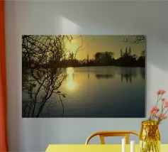 Questa composizione simmetrica è dedicata all'ambiente rilassante dell'acqua, al riflesso della natura e ai colori magici del tramonto in inverno. La luce dorata del sole si riflette sulla superficie dell'acqua. La scena è caratterizzata anche da toni blu scuro e riflessi di luce grigio-argento. Le aree ghiacciate e i dolci movimenti dell'acqua conferiscono al riflesso invernale un effetto astratto.