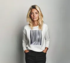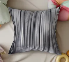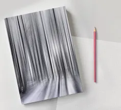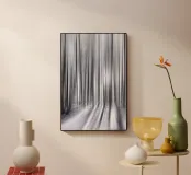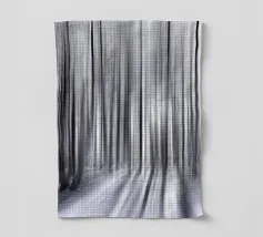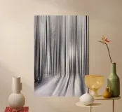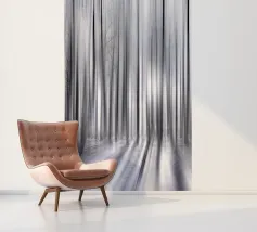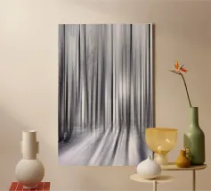 Abstract winter forest with tall, slender trees that merge into vertical lines through motion blur. Grey and white tones and soft light create a calm, almost dreamlike atmosphere full of depth and elegance.