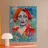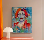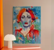 Un suggestivo ritratto di donna il cui volto è ornato da vistose macchie di vernice rossa e blu, con un effetto di sgocciolamento, su uno sfondo vibrante, astratto e colorato.
