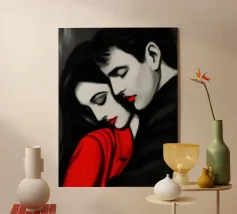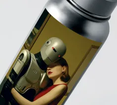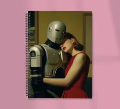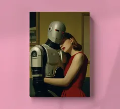 Questa scena surreale combina film noir e fantascienza. Una donna in abito rosso abbraccia un robot retrò in un interno arredato in stile classico: Edward Hopper incontra Fritz Lang. Lo stile pittorico iperrealistico e la calda combinazione di colori creano l'intimità nostalgica del realismo americano, mentre il tema solleva questioni assolutamente contemporanee. Quest'opera concettuale esplora il rapporto uomo-macchina con ironia poetica. Perfetto per chi apprezza l'estetica cinematografica, la profondità filosofica e la freddezza retrofuturistica.