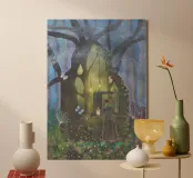 Questo collage a tecnica mista è stato creato con ritagli di riviste, colori acrilici e inchiostro, per creare un'atmosfera magica nella foresta delle streghe.