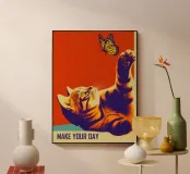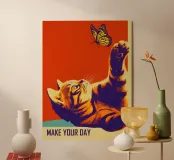 Questo affascinante poster motivazionale combina una fotografia giocosa con un'estetica vintage. L'intensa combinazione di colori bicolore, arancione brillante e viola intenso, ricorda le serigrafie psichedeliche degli anni Sessanta. Il gatto curioso che raggiunge la farfalla monarca simboleggia la gioia infantile e l'esperienza consapevole. Lo slogan "MAKE YOUR DAY" sottolinea il messaggio positivo senza essere invadente. L'elaborazione dell'immagine in formato poster conferisce all'opera una chiarezza grafica. Una dichiarazione sulla gioia di vivere, sulla curiosità e sulla ricerca della felicità nei piccoli momenti - ispiratrice e decorativa.