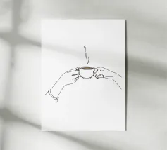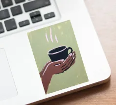 Illustrazione astratta di una mano scura che tiene una tazza di caffè nero. Un delicato vapore sale in leggere linee color lavanda. Lo sfondo è verde chiaro con pennellate sottili. Composizione minimalista con attenzione alla forma, al colore e all'equilibrio.