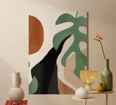 L'immagine presenta un'illustrazione astratta con una grande foglia di monstera nera e il contorno di una mano. Lo sfondo è costituito da forme morbide e fluide nei toni del beige e del marrone, che creano un'atmosfera armoniosa e organica.