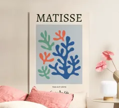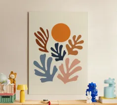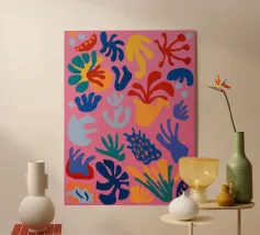 Un motivo di foglie stilizzate nei toni del verde, del rosa e della terracotta, ispirato ai ritagli di Henri Maraoui. La disposizione suggerisce una danza aggraziata di forme botaniche.