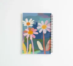 An abstract, minimalist artwork featuring two stylized daisies in soft pastel pink and orange hues, set against a vibrant multicolor background. The daisies are reduced to geometric, flowing shapes, capturing the essence of their petals and stems in a sleek, modern style reminiscent of the 70s. Bold, contrasting colors in the background—blues, yellows, and purples—create a dynamic, urban feel, while the soft pastel tones of the flowers bring a sense of calm. This piece combines retro charm with contemporary minimalism, perfect for a modern, creative space.
