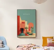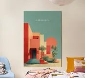 A bold minimalist poster capturing the vibrant architecture of Marrakech under a glowing sun. With sharp desert geometry, soft palm shadows, and a retro pastel palette of coral red and turquoise, this modern travel artwork blends Mediterranean heat with Bauhaus balance — ideal for dopamine décor, summer vibes, or statement wall art.