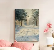 Una tranquilla mattina d'inverno si dispiega in questo dipinto d'atmosfera: un sentiero innevato nella foresta conduce attraverso alti abeti ricoperti di brina. La luce delicata del sole nascente filtra attraverso gli alberi e inonda il paesaggio di un caldo bagliore dorato. Le tracce sulla neve raccontano il movimento nella quiete: natura, pace e luce si combinano per creare un armonioso idillio invernale.