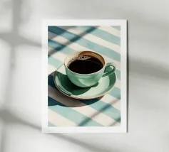 Illustrazione vivace di un croissant fresco e di una tazza di caffè nero su un tavolo a righe verdi e bianche. Questa luminosa scena di colazione conferisce un'atmosfera da caffè chic alla vostra cucina o sala da pranzo e aggiunge un tocco accogliente al vostro rituale mattutino.