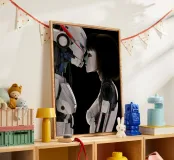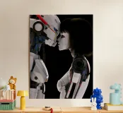 Due androidi bianchi e lucidi quasi si toccano le labbra: lui un robot da combattimento spigoloso, lei una bellezza delicata, quasi da geisha, con accenti rossi. Ispirato a "Ghost in the Shell" di Shirow Masamune, ai robot pin-up di Hajime Sorayama e all'estetica di Blade Runner. Il freddo metallo incontra il tenero desiderio, la tecnologia diventa anima. Questa immagine è pura poesia fantascientifica: erotica, malinconica, futuristica. Perfetto nella sua esecuzione, soprattutto per i gamer loft, i fan del cyberpunk e chiunque non sia freddo nei confronti della cultura giapponese contemporanea, dei manga e degli anime.