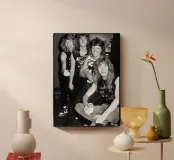 Una foto promozionale in bianco e nero di una band seduta davanti a una batteria. I membri sono in posa giocosa con grandi sorrisi e un linguaggio del corpo rilassato, con la scritta "Anthrax" in basso.