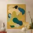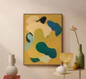 A calming abstract piece features flowing, liquid like shapes in a mellow, earthy palette of mustard yellow, green, and beige, creating a sense of gentle movement.