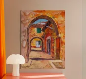 Una vista attraverso un arco in pietra rustica e rovinata dalle intemperie rivela una vivace scena di mercato, con i toni caldi e terrosi dell'architettura che creano una cornice senza tempo per un momento di vita quotidiana.