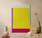This modern art print impresses with its clear geometry and vibrant colour combination. With bold yellow, burgundy red and a hint of light blue, this abstract design immediately catches the eye. The minimalist approach gives the image a calming balance, while the bold colours provide an interesting contrast. Perfect for contemporary art lovers who want to add a stylish and colourful element to their rooms.
