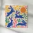 Uno stravagante motivo di arte popolare presenta conigli blu stilizzati che si divertono in mezzo a fogliame rosso e arancione sotto un sole giallo brillante.