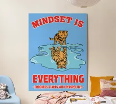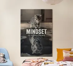 This motivational artwork features a small kitten gazing into a puddle, where its reflection shows a powerful tiger. With the inspiring quote “Mindset is Everything – Progress Starts with Perspective,” it symbolizes confidence, self-belief, and growth. A perfect reminder that perspective shapes potential and dreams begin with mindset.
