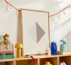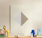 A minimalistic diamond shape is divided equally into two contrasting triangles, one light gray and the other beige, set against a cream background. The geometric simplicity and neutral tones evoke a sense of modern elegance.