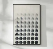 Un'opera d'arte astratta concettuale e minimalista composta da una griglia precisa di forme circolari, che passa gradualmente da valori tonali chiari a valori scuri. Ogni cerchio è sottilmente segmentato in campi geometrici, creando un tranquillo ritmo matematico e un senso di progressione sistematica.