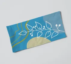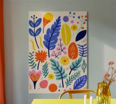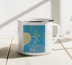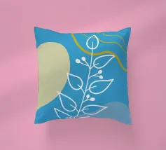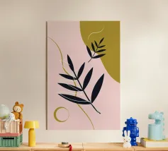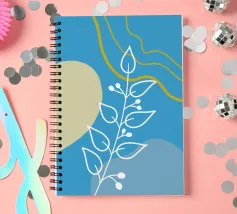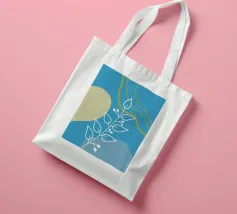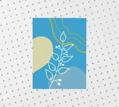 Un disegno botanico minimalista presenta un ramo bianco delineato con foglie. Linee curve e forme organiche nei toni del blu, del verde e del giallo creano uno sfondo moderno e astratto.