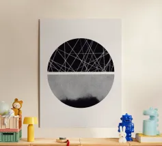 Opera d'arte geometrica minimalista con linee nere e una forma rotonda in verde salvia e texture su sfondo beige.