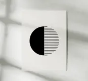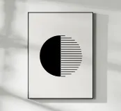 Opera d'arte geometrica minimalista con linee nere e un semicerchio nero su uno sfondo beige neutro e morbido.