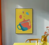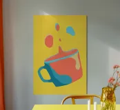 Una vibrante collisione di colori e forme, questa opera d'arte digitale minimalista cattura il caos giocoso di una tazza inclinata a metà. Su uno sfondo giallo dopamina, il design ispirato alla pop-art mescola corallo, verde acqua e toni pastello in un pezzo visivamente incisivo, ideale per dare energia a cucine moderne, angoli caffè o spazi creativi eccentrici.