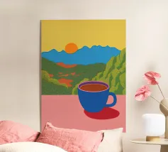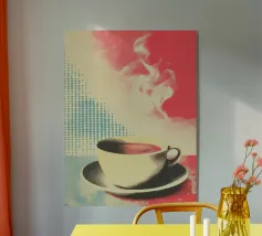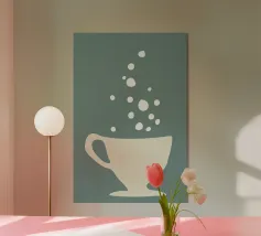 Una vibrante collisione di colori e forme, questa opera d'arte digitale minimalista cattura il caos giocoso di una tazza inclinata a metà. Su uno sfondo giallo dopamina, il design ispirato alla pop-art mescola corallo, verde acqua e toni pastello in un pezzo visivamente incisivo, ideale per dare energia a cucine moderne, angoli caffè o spazi creativi eccentrici.