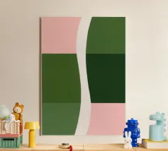 Blocchi di colore minimalisti rosa, verdi e bianchi su uno sfondo color salvia, realizzati con colori acrilici.