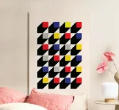 Un poster digitale Op Art dinamico e ipnotico, ispirato ai movimenti De Stijl e Bauhaus. Il disegno presenta una griglia di triangoli bianchi e neri alternati che creano un forte senso di profondità tridimensionale e un motivo di ombre a scacchiera. Piccoli quadrati nei colori primari - rosso, blu e giallo - e nel grigio, sembrano fluttuare sopra la superficie, proiettando ombre distinte. Questa illusione visiva di grande impatto è un moderno pezzo da novanta. Questo download digitale di alta qualità vanta 7000x5000 pixel a 300 dpi, garantendo una chiarezza eccezionale e una qualità di stampa superiore.