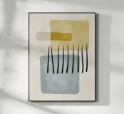 Arte digitale astratta con linee, forme organiche e geometriche con texture e pennellate nere in morbide tonalità pastello di marrone, ocra, blu e beige. Arte moderna per interni essenziali, scandinavi, bohémien e boho. Godetevi l'arte digitale minimalista con forme e linee morbide.