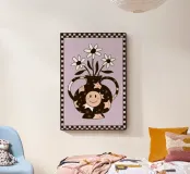 A whimsical illustration of a monkey sitting on a woman's head, who is holding a vase of flowers. The scene is a playful, surreal, and charming depiction of a chaotic and fun moment.