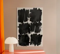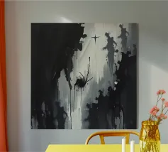 Linee nere marcate, griglie che si intersecano e schizzi d'inchiostro sparsi convergono in un'esplosione centrale di energia che attira lo spettatore verso l'interno. Strati di lavaggi grigio fumo ammorbidiscono la geometria, creando profondità e atmosfera, mentre elementi lineari nitidi impongono ordine al movimento fluido.