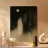 Una scena sfocata e monocromatica evoca un senso di mistero con un elemento circolare luminoso in alto a sinistra, che forse suggerisce una luna. Le striature e le macchie verticali creano un'atmosfera spettrale ed eterea.