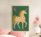 Step into enchanted meadows with this poised unicorn, ivory coat dusted in starbursts, mane blazing gold beneath a crescent moon. Inspired by folk tapestries and storybook pages, the clean graphic lines and lush forest‑green backdrop lend modern elegance to nursery walls, reading corners or dreamy bedrooms. Printed on archival stock, every subtle brush pore whispers wonder. Let this gentle guardian remind young and grown hearts alike to believe in magic, stride with grace and chase luminous horizons. A perfect gift for birthday dreamers, wedding couples or anyone wanting daily doses of hope.