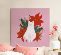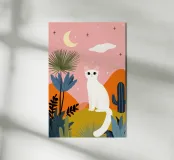 Illustrazione di un gatto sognante sotto una luna crescente con piante del deserto e accenti stellati. I colori pastello e i toni caldi creano un'atmosfera calma e giocosa, perfetta per gli amanti dei gatti che amano l'arte boho moderna e stravagante. Aggiunge un po' di magia, serenità e fascino alla vita quotidiana.