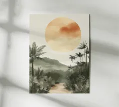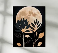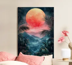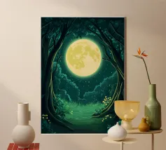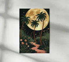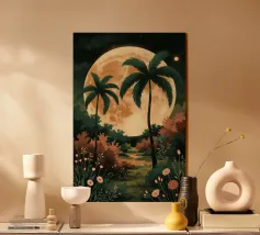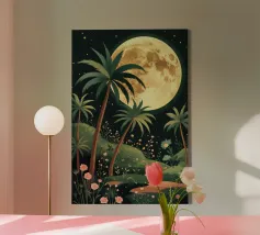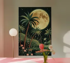 Un'ipnotica scena notturna con palme lussureggianti immerse nel bagliore di una luna piena sovradimensionata. Il verde intenso contrasta meravigliosamente con il cielo notturno, mentre i fiori delicati sbocciano sotto la luce celeste. La scena cattura una qualità onirica, fondendo la bellezza naturale con un'atmosfera eterea, quasi surreale. I toni caldi della luna creano un contrasto sorprendente con i verdi profondi e i rosa tenui dell'ambiente floreale. Quest'opera d'arte evoca tranquillità e meraviglia, rendendola un pezzo ideale per gli amanti dei paesaggi celesti.