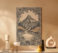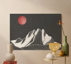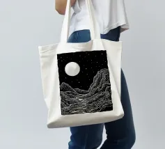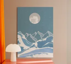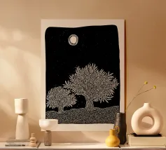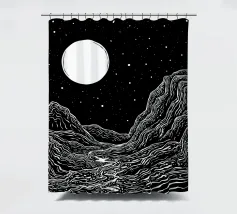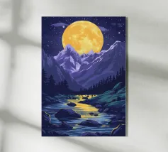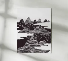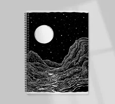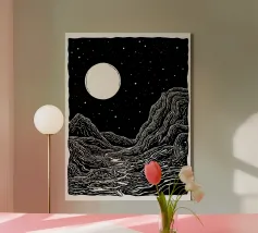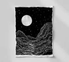 Questa stampa in bianco e nero in stile linoleografia ritrae un ipnotico paesaggio notturno. Una luna piena splendente domina il cielo stellato, proiettando la luce su un fiume tortuoso che scorre tra montagne aspre e strutturate. L'intricato lavoro al tratto crea un senso di movimento e profondità, evocando mistero e tranquillità.