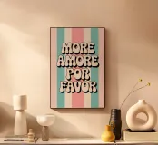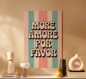 Poster vettoriale retro groovy con la scritta "More Amore Por Favor". Sfondo a strisce in rosa pastello, blu e crema, abbinato a una tipografia anni '70 per un design retrò giocoso e colorato.