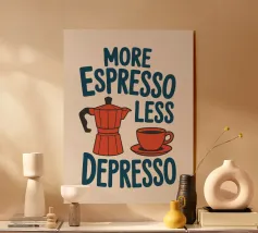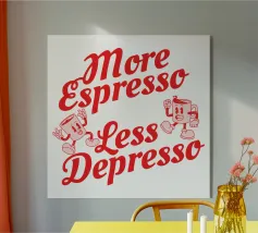 Un poster umoristico per tutti gli amanti della caffeina: "More Espresso, Less Depresso" porta il buon umore e una strizzatina d'occhio a qualsiasi parete. Con il suo aspetto disegnato a mano in arancione e verde scuro, è perfetto per la cucina, l'ufficio o il bar. Sia che si tratti di un regalo per i drogati di caffè o di un inizio di giornata motivante, questo poster è garantito per risollevare l'umore.