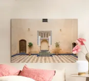 Architettura marocchina in colori pastello. Piante botaniche, porta, piastrelle e parete color pastello.