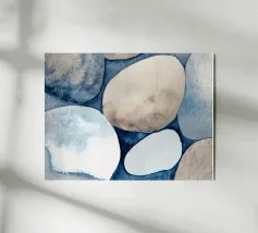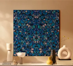 Questo mosaico presenta una varietà di pietre lisce nei toni del blu, del turchese e della terra, creando un design accattivante perfetto per le superfici decorative.