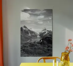 Questa fotografia accattivante offre una vista serena di un lago di montagna, che riflette perfettamente le cime aspre e le chiazze di neve circostanti. Parzialmente ricoperte di vegetazione, le maestose montagne si protendono verso un cielo parzialmente nuvoloso, aggiungendo un tocco di misticismo al paesaggio. Ideale per gli amanti della natura e per coloro che apprezzano la tranquilla bellezza dell'aria aperta, questa immagine conferisce un senso di pace e di splendore naturale a qualsiasi spazio.