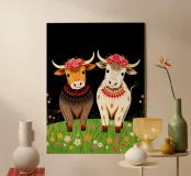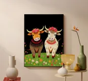 Simpatiche mucche scozzesi stravaganti in un prato selvaggio con copricapi floreali.