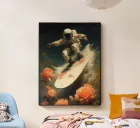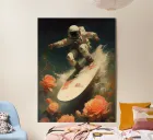 "In the first installment of the "My Space" series, we dive into a cosmos of unique beauty, where elements of nature intertwine with the vastness of distant galaxies. At the heart of this cosmic odyssey, we find our beloved astronaut Ed, who, after losing sight of his original mission, has embraced space exploration with a more leisurely approach. Today, in his galactic surfing session, we see him gracefully gliding through the stellar waves."