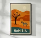 A poster in fiery tones for an untamed land. Namibia, its orange dunes, free-roaming zebras and petrified trees come to life in a striking, stylised composition. Ideal for a powerful decor, combining extreme nature and graphic beauty. Every curve tells the story of Africa.