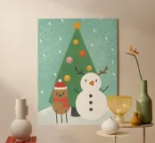 Cheerful illustration featuring a decorated Christmas tree, a smiling snowman, and a cute reindeer, radiating a Christmas spirit full of cheerfulness and happiness.