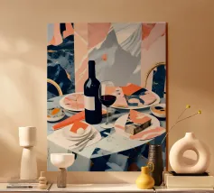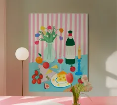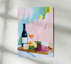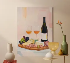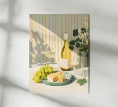Gioia culinaria in uno stile trendy e artigianale: questa affascinante natura morta celebra l'arte di assaporare. La tavolozza calda - giallo oro brillante, albicocca delicata, petrolio intenso - ricorda i manifesti dei bistrot francesi. Il tratto sciolto dell'inchiostro e i motivi floreali decorativi creano un'eleganza rilassata. Formaggio, vino, uva e stoviglie floreali sono disposti in un inno allo stile di vita mediterraneo. Lo stile pittorico bidimensionale mostra anche influenze del design scandinavo. Un'opera d'arte appetitosa per buongustai e intenditori, perfetta per la cucina, la sala da pranzo o il ristorante.
