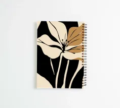 A bold, abstract floral pattern is depicted in black, beige, and brown, showcasing the elegance of a stylized flower. The interplay of colors and shapes creates a dynamic yet harmonious composition.